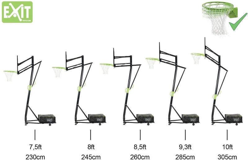 Het EXIT Galaxy basketbalbord is te verstellen in vijf verschillende standen (230 – 245 – 260 – 285 – 305 cm). De hoogste stand van 305 cm is de officiële wedstrijdhoogte.