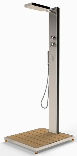De stijlvolle Elba buitendouche is gemonteerd op de bijgeleverde WPC vloerplaat. Zo blijft de douche van 36 kilo stevig op zijn plek staan. De douchekop hangt op een hoogte van 200 cm en de totale hoogte van de douche is 210 cm. Zo geniet het hele gezin van een verfrissende douchebeurt, gewoon in jullie eigen achtertuin!